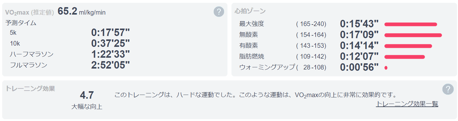 Estimated VO2max(推定最大酸素摂取量) : 65.2 mL/kg/min